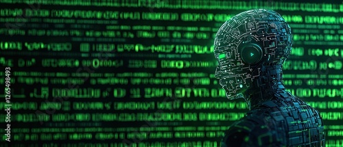 Digital Humanoid in Green Code Matrix Background