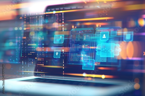 Digital identity with virtual documents and futuristic icons.