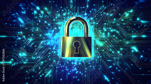 digital illustration of cybersecurity and data centre protection. Metallic padlock green future, futuristic. Science technology data server room circuit abstract password cyber security hacker protect