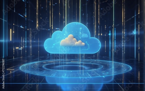 Digital informational technology web futuristic hologram with cloud icon, blue light digits, and code background, cloud computing. Abstract Motion of digital data flow.