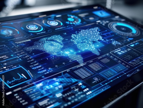Digital interface displaying data analytics on a screen, showcasing global connectivity and advanced technology trends.