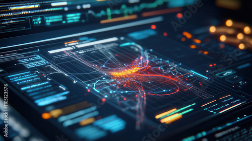 Digital interface displaying interconnected technology with vibrant data visualizations, showcasing complex analytics and modern design elements