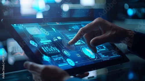 Digital Interface Touch: A person interacts with a sleek digital interface on a tablet, showcasing complex data visualizations and modern technology.