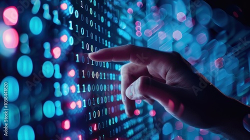 Digital Interface with a Hand Interacting with a Binary Code Background