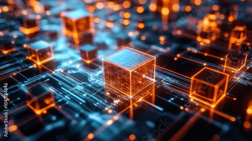 Digital interface with interconnected glowing cubes on a tech process backdrop