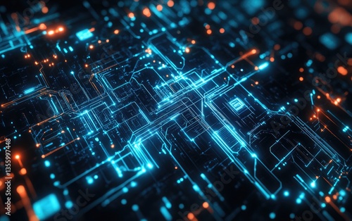 Digital light patterns weave a blue tech matrix across the abstract fiber optic backdrop
