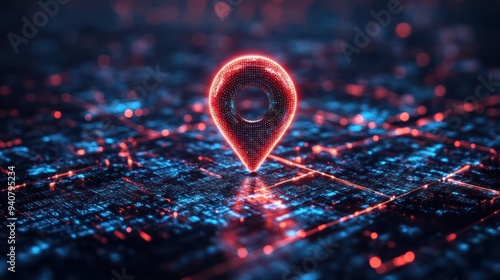 Digital location pin icon with binary code, artificial intelligence in navigation applications