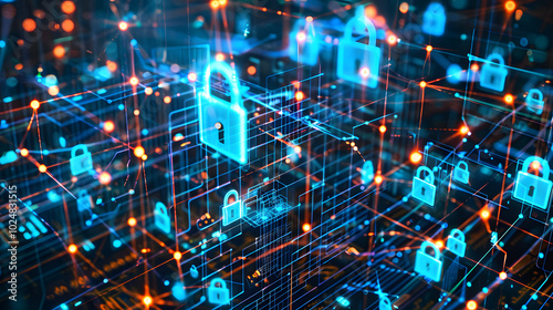 Digital Lock and Key: An intricate digital lock surrounded by swirling lines of code and binary data, symbolizing the complex nature of encryption protecting valuable information