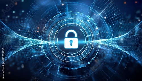 Digital lock symbol in a high-tech environment, representing cybersecurity and data protection, surrounded by flowing data streams.