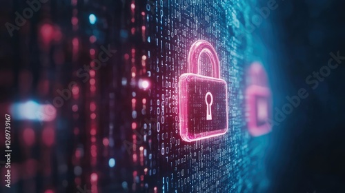 Digital lock symbol on a binary code background, representing cybersecurity and data protection.