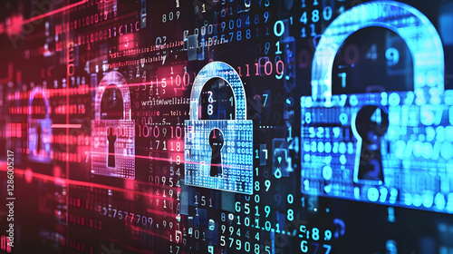 Digital locks and binary code representing cybersecurity in a futuristic technology landscape