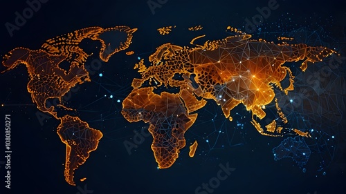 Digital Map Illustration with Illuminated Global Network Connections Highlighting Interconnected World Data Flow Patterns