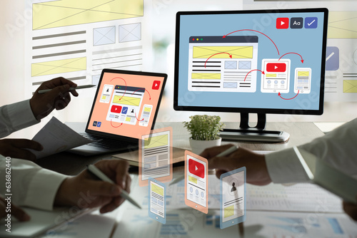 digital marketing businessman hand working with computer UI designer brainstorming social network, SEO application technology, and digital marketing
