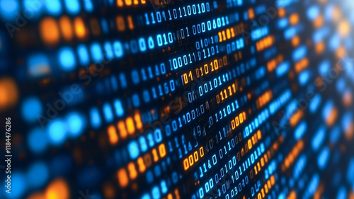 Digital Matrix: A mesmerizing digital matrix of binary code, illuminated in vibrant blue and orange hues, representing the intricate world of data and technology.