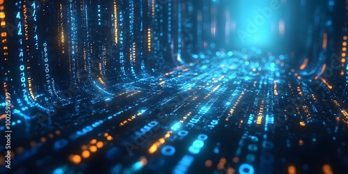 Digital matrix background with vertical streams of binary code and glowing numbers Abstract technology concept with futuristic computer network visualization and illuminated data strings
