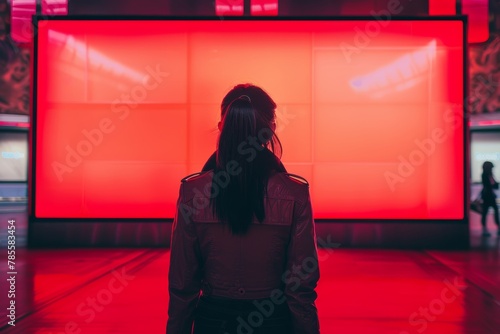 Digital mockup over a shoulder of a woman in front of a interactive digital board with a fully red screen