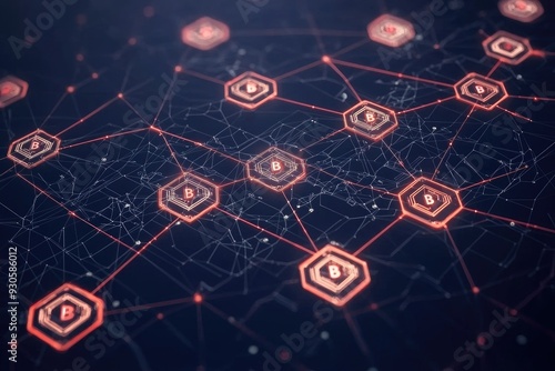 Digital network representation with interconnected hexagons and nodes, illustrating blockchain technology and data flow.
