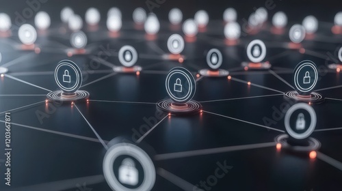 Digital network security concept with padlock symbols connected in a web of illuminated nodes on a dark background