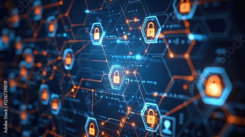 Digital network security illustration with interconnected nodes and padlocks representing cybersecurity