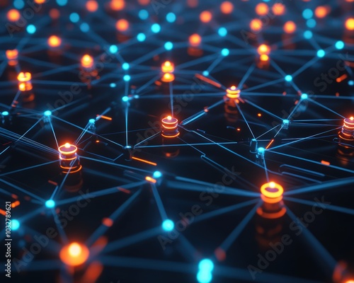 Digital network with interconnected nodes and glowing data points