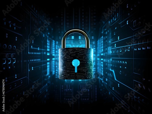 Digital padlock for computing system on dark blue background. Generative AI