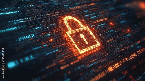 Digital padlock icon on a computer screen, surrounded by moving binary code, symbolizing cybersecurity and data protection.