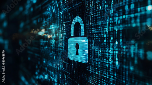 digital padlock icon, with binary code cascading around it. A digital shield and firewall symbols dominate the cybersecurity .Android robot navigating through a cyber digital world.