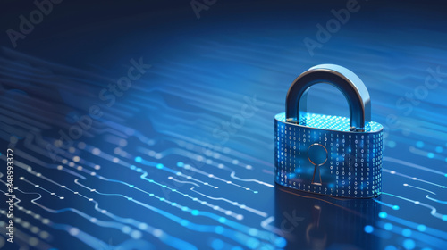 Digital padlock on blue background with binary code symbolizing cyber security technology