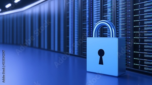 Digital padlock symbolizing data security protection in a modern data center environment with server racks
