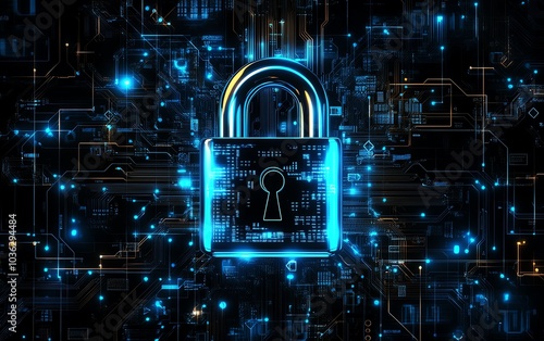 Digital padlock with glowing blue circuits, surrounded by a dark background and binary code, representing secure data protection in a hightech world