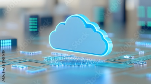 Digital representation of cloud computing with highlighted data transfers on a futuristic tech background.
