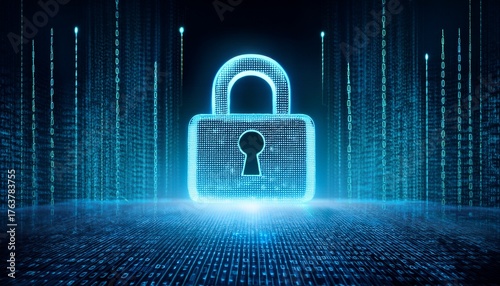 digital screen glowing softly behind 3d lock with minimal binary patterns floating around