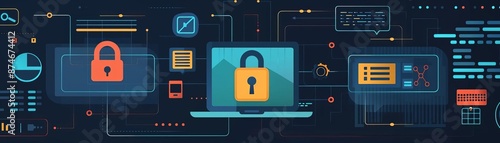Digital security concept background with locks and computer icons representing cyber security and data protection.