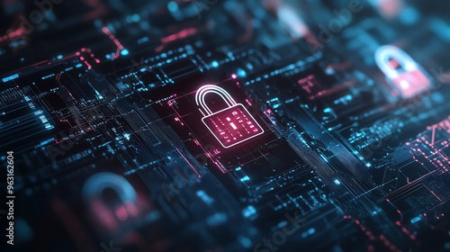 Digital security concept featuring a glowing lock icon on a circuit board, representing data encryption and cybersecurity.