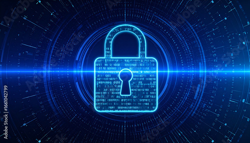 Digital security concept with a glowing padlock representing data protection and network safety.