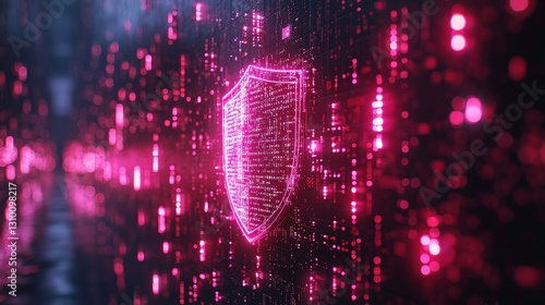 Digital security concept with glowing shield and binary code, representing protection and technology