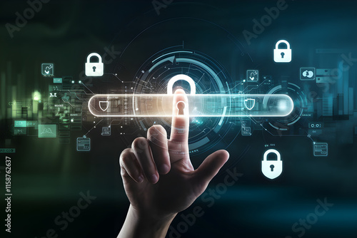 Digital Security Concept With Hand Pressing Lock Icon Interface