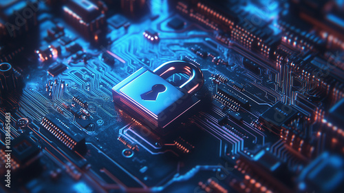 Digital Security Concept with Padlock and Computer Chip - Cyber Web Technology Background
