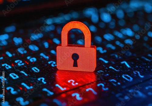 Digital Security Concept with Red Lock on Colorful Binary Background