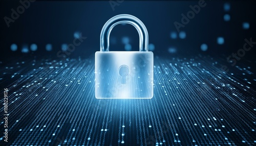 Digital security image with a glowing lock symbol on a background with precise patterns placed to represent encrypted codes