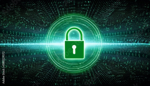 Digital security image with a glowing lock symbol on a background with precise patterns placed to represent encrypted codes