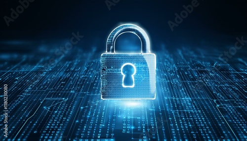 Digital security image with a glowing lock symbol on a background with precise patterns placed to represent encrypted codes