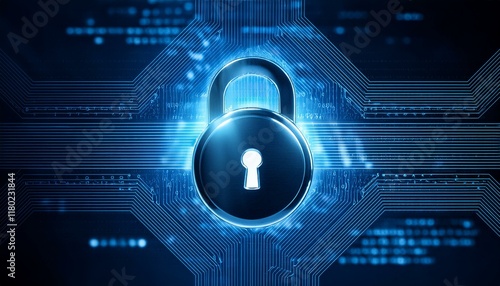 Digital security image with a glowing lock symbol on a background with precise patterns placed to represent encrypted codes