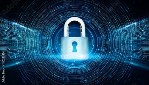 Digital security image with a glowing lock symbol on a background with precise patterns placed to represent encrypted codes