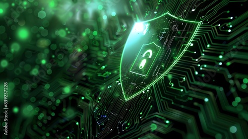 Digital shield and lock green light futuristic circuit board selective focus dynamic manipulation high-tech background