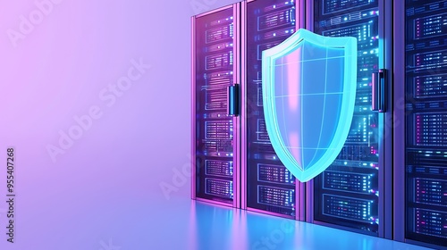 Digital shield protecting server data center, symbolizing cybersecurity, data protection, and internet security in a modern technology environment.