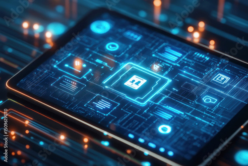 Digital tablet displaying electronic circuitry and user interface concepts with abstract technology elements