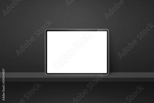 Digital tablet pc on black wall shelf. Horizontal background banner