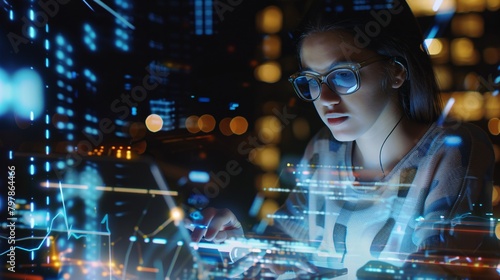 Digital tech expert using holographic coding and analyzing data on a tablet while researching cybersecurity on a 3d screen.