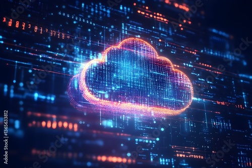 Digital technology background with glowing cloud icon and binary code on a digital screen
